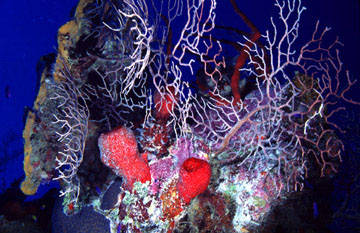 Tarpon Alley, Grand Cayman. The Red Sponges in the foreground appear black at 100 feet underwater. The strobe flash of the camera brings out the true color.