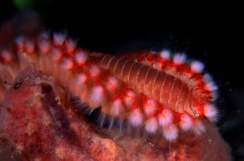 The light reflecting off the back of this Fire Worm gave him a copper sheen as he worked his way along the rail of the wreck of the Jado Trader in South Guanaja.