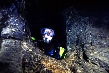 A diver peers through "The Keyhole" on one of the 24 dive trails marked by the staff of West End Divers.