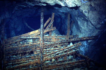 One of many mine passageways - this one partially is blocked by a steel reinforced rock fall.