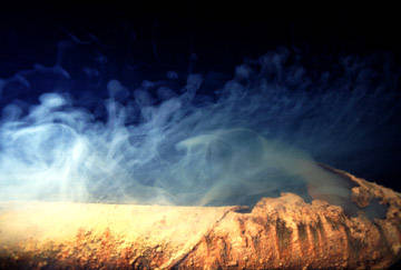 Iron, like this pipe develops 'smoke' as it slowly oxidizes in the perfectly still water at Bonne Terre Mine. These plumes drifted from the pipes over a week's time appearing as smoke from a burning cigarette does when captured on film.