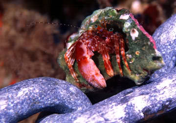This Hermit Crab found himself in a rather precarious position resting on an anchor chain.