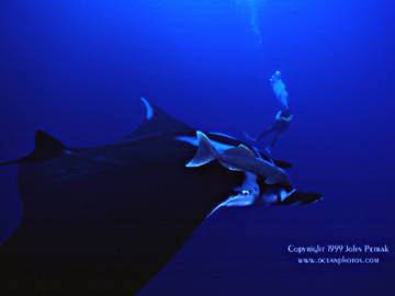 Giant Manta, Remoras and Diver, Socorro, Mexico